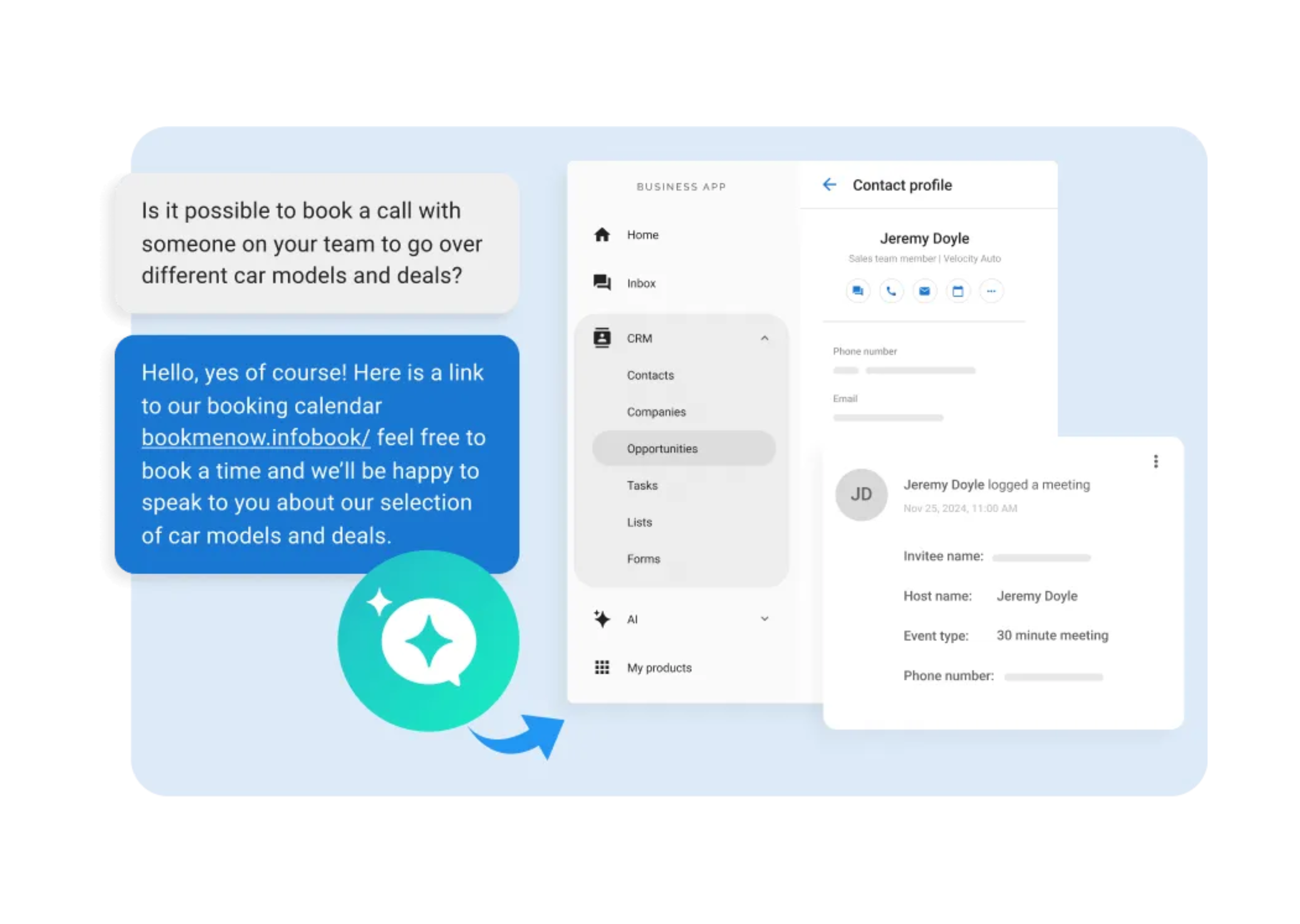 El asistente virtual consigue que los clientes potenciales calificados agenden citas directamente en el calendario de la empresa y pone toda la información de contacto y el contexto de la conversación en el CRM.