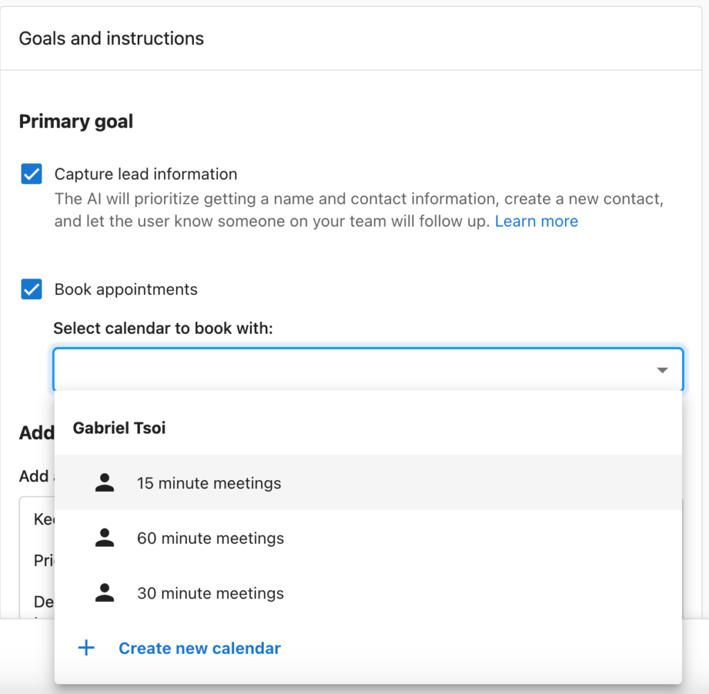 El asistente primero recopilará el nombre, correo electrónico y teléfono del visitante antes de completar la reserva. Esto asegura que retengas la información del lead incluso si la conversación termina antes de completar la reserva.